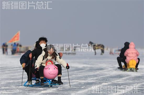2023年1月1日,游客在博斯腾湖大河口景区体验冰上项目。