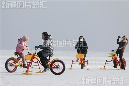 2023年1月1日,游客在博斯腾湖大河口景区体验冰上项目。