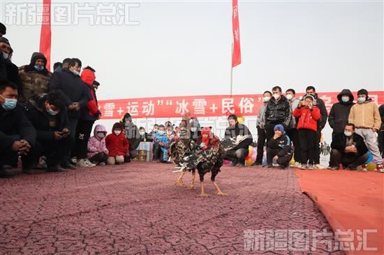 2022年12月30日,在乌什县依麻木镇托万克麦盖提村滑冰场地,游客在观看斗鸡比赛。