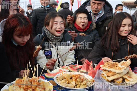 2022年12月30日,乌什县依麻木镇托万克麦盖提村冰雪场上的特色美食展吸引了众多游客品尝。