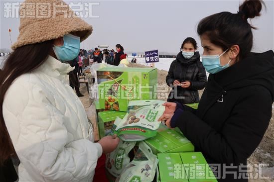 2022年12月30日,游客在乌什县依麻木镇托万克麦盖提村冰雪场上选购当地农副产品。