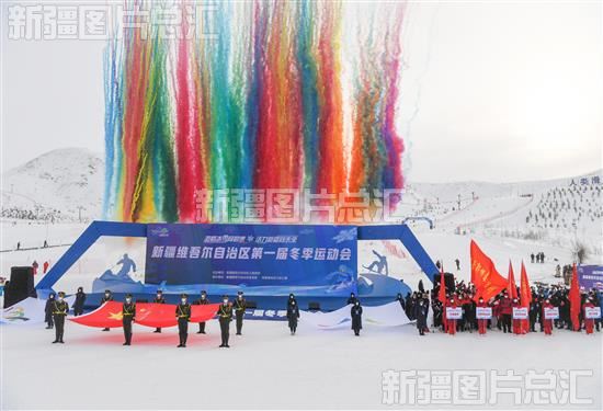 当日,新疆维吾尔自治区第一届冬季运动会在阿勒泰市将军山国际滑雪度假区开幕。此次冬季运动会展现出新疆继续巩固拓展“带动3亿人参与冰雪运动”成果,邀请援疆省市运动员参赛的创新作法,有力促进了全国各地冰雪运动的交流。图为运动会开幕现场。