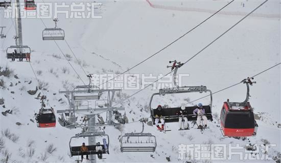 2023年1月5日,滑雪爱好者在阿勒泰市将军山滑雪场乘坐缆车上山。