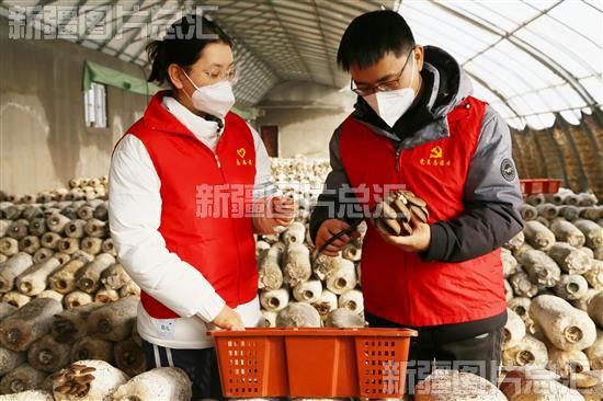 2023年1月3日,党员志愿者在阿瓦提县塔木托格拉克镇玉斯屯克阿热勒村蘑菇种植基地帮助农户采收蘑菇。