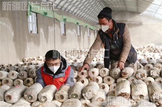 2023年1月3日,党员志愿者在阿瓦提县塔木托格拉克镇玉斯屯克阿热勒村蘑菇种植基地帮助农户采收蘑菇。
