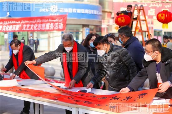 2023年1月8日,志愿者在洛浦县艾德莱斯广场为群众写春联,送祝福。