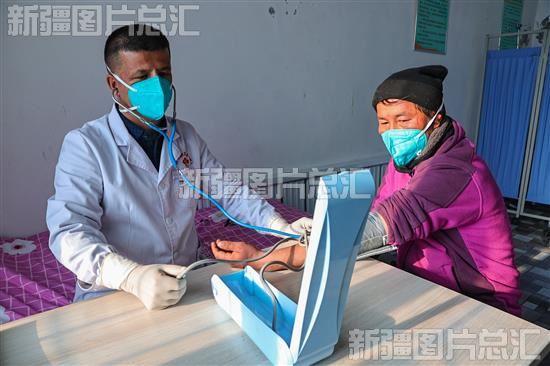 2023年1月8日,医务人员在为伊宁市英也尔镇牧民测量血压。