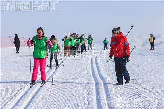 2023年1月12日,在温泉县越野滑雪场,冬令营学生在教练指导下练习滑雪。