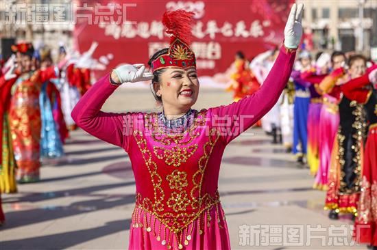 当日,来自库车市四个乡镇街道的社火表演队在该市市民广场举行“瑞兔迎新春·过年七天乐”主题社火表演活动,为市民奉上春节文化大餐。