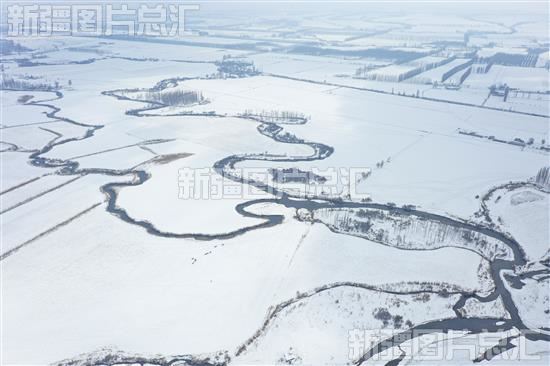 2022年2月17日,久违的一场降雪,使新源县田野大地被大雪覆盖,呈现出一幅银装素裹的壮美画面(无人机拍摄)。