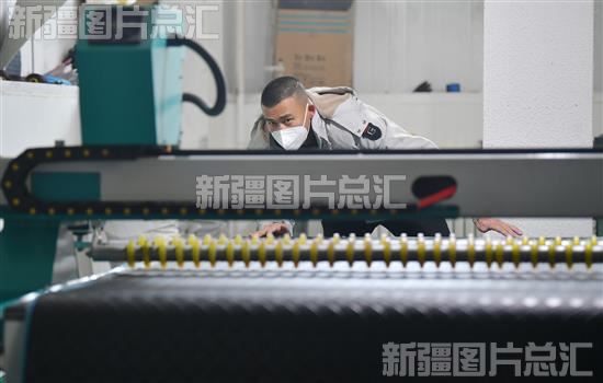 2023年1月30日,位于伊宁市东梁产业示范园的一家汽车脚垫卷材生产企业员工在查看设备运行情况。