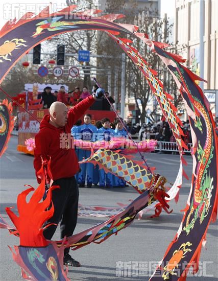 当日,哈密市伊州区各社火表演队走上街头,为市民献上了花车巡游、扭秧歌、踩高跷等精彩民俗表演。