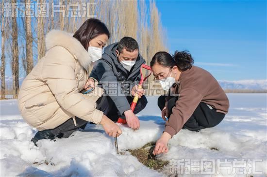 2023年2月2日,新源县农业农村局技术人员拨开积雪,查看小麦生长情况。