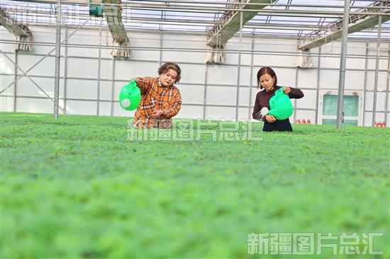 2023年2月3日,库车市比西巴格乡其乃巴格村农民在给菜苗浇水。