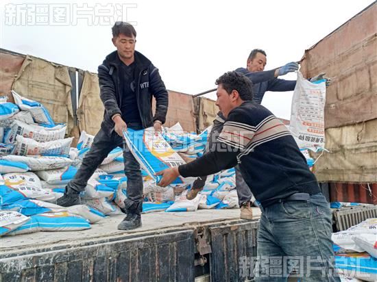 2023年2月6日,温宿县恰格拉克乡吉格代村村民在卸载化肥。