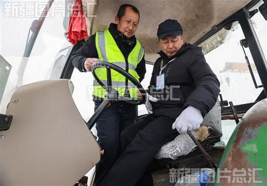 2023年2月6日,博乐市乌图布拉格镇乌图布拉格村,拖拉机驾驶员培训班讲师教授学员驾驶拖拉机。