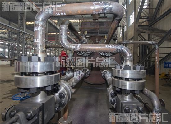 2023年?2月8日,位于克拉玛依市白碱滩区(克拉玛依高新技术产业开发区)的新疆油田公司应急抢险救援中心七分公司生产车间,工人正在检查油田生产装置半成品。