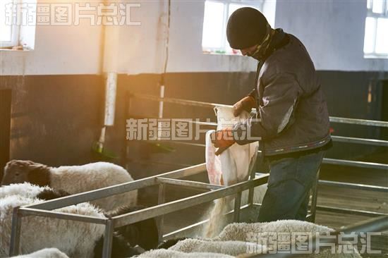 2023年2月8日,托里县绿丰源种养殖农民专业合作社工作人员在喂养湖羊。
