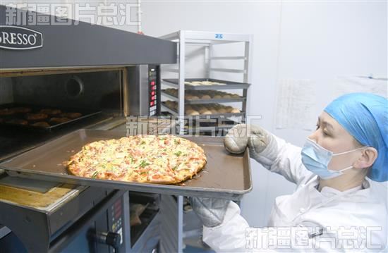 2023年2月12日,员工在博乐市青得里镇定吉格村小微产业园内的博尔塔拉蒙古自治州雅绘食品生产有限公司制作披萨。