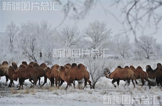 2023年2月11日,行走在雾凇林中的骆驼群。