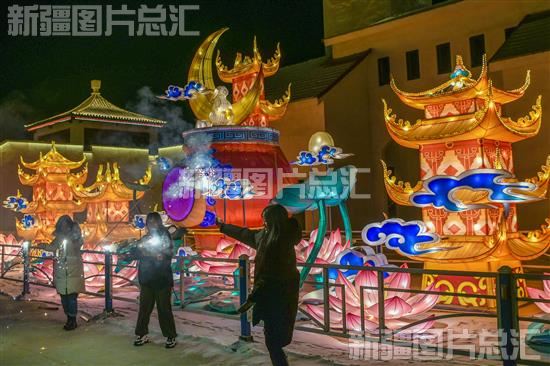 2023年1月22日凌晨,农历大年初一,游客和村民在克拉玛依市乌尔禾区乌尔禾镇“西部乌镇”举办的灯会节上观赏游玩,欢度新春佳节。
