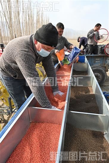 2023年2月13日,焉耆回族自治县七个星镇七个星村村民给播种机加装小麦种子。
