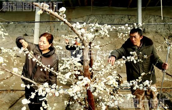 2023年2月14日,职工在新疆生产建设兵团第二师22团果树大棚里疏花。