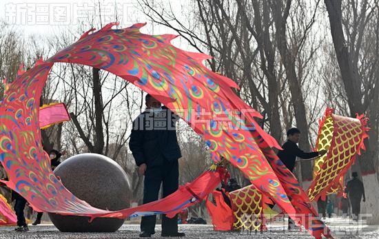 2023年2月17日,市民在库尔勒市孔雀河旅游风景带舞动“彩带龙”。