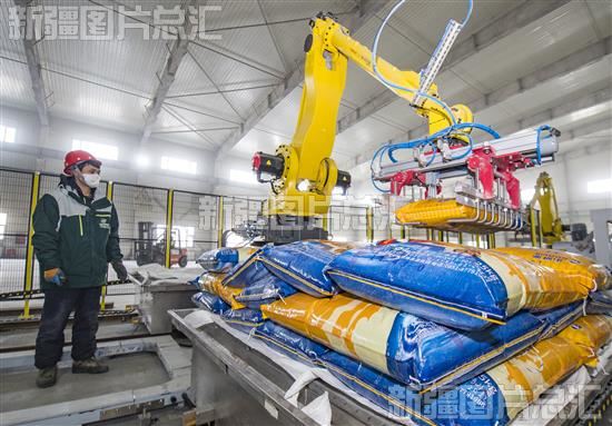 2023年2月15日,位于昌吉国家高新技术产业开发区的新疆诺威施农业科技有限公司车间,码垛机械手在生产线上作业。