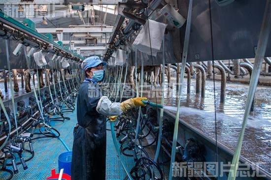 2023年2月14日,克拉玛依绿成农业开发有限责任公司奶牛养殖基地,工作人员在清洗挤奶厅。