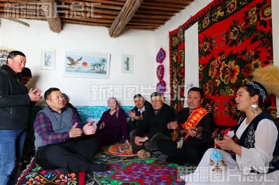 2023年2月17日,阿勒泰市喀拉希力克乡“冬不拉”文艺小分队队员在萨吾尔山牧区为牧民宣讲党的政策。