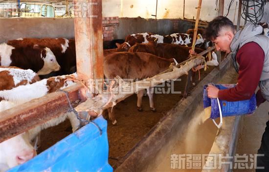 2023年2月18日,福海县解特阿热勒镇萨尔塔和太村养殖户在给牛添饲料。