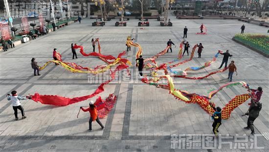 2023年2月21日,库尔勒市“彩带龙”健身爱好者在人民广场进行表演,迎接“二月二”“龙抬头”。
