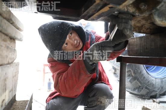 2023年2月22日,农技人员在五家渠市共青团农场农机合作社检修大马力拖拉机。