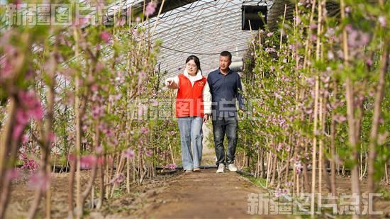 2023年3月1日,志愿者与桃农一起查看桃树生长情况。?