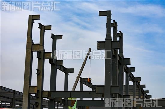 关键字:喀什地区 喀什市 工业 喀什综合保税区 电子出口加工园区 建设项目 工人 建设者 建设工地 安装 吊装 钢梁 提速 提效