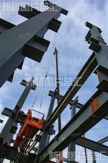 关键字:喀什地区 喀什市 工业 喀什综合保税区 电子出口加工园区 建设项目 工人 建设者 建设工地 安装 吊装 钢梁 提速 提效