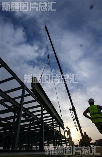 关键字:喀什地区 喀什市 工业 喀什综合保税区 电子出口加工园区 建设项目 工人 建设者 建设工地 安装 吊装 钢梁 提速 提效