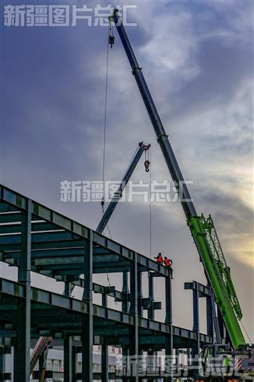 关键字:喀什地区 喀什市 工业 喀什综合保税区 电子出口加工园区 建设项目 工人 建设者 建设工地 安装 吊装 钢梁 提速 提效