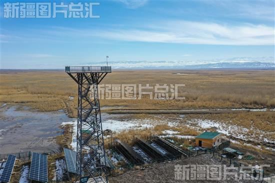 那拉提国家湿地公园内安置的瞭望塔(2023年3月2日无人机拍摄)。