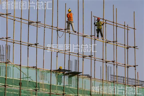 2023年3月15日,工人在喀什经济开发区纺织家纺产业园建设工地安装脚手架。
