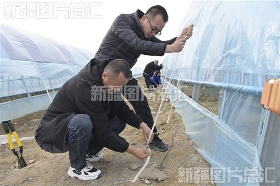 2023年3月13日,和布克赛尔县水利局驻夏孜盖乡巴音托洛盖村“访惠聚”工作队队员在当地“玉露香梨”大棚里帮助果农稳固大棚。