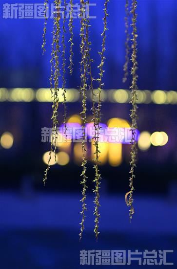 2023年3月13日,在库尔勒市孔雀河畔,夜幕下吐出嫩芽的“成帮柳”。