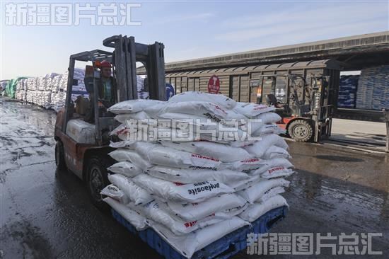 2023年3月6日,在位于乌鲁木齐经济技术开发区(头屯河区)的新疆农资(集团)有限责任公司北站仓储分公司,工作人员驾驶叉车,积极装运化肥等春耕物资。