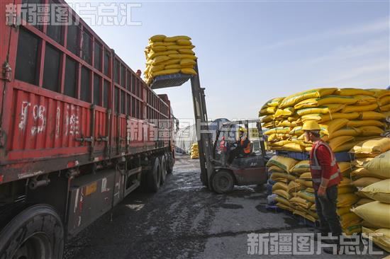 2023年3月6日,在位于乌鲁木齐经济技术开发区(头屯河区)的新疆农资(集团)有限责任公司北站仓储分公司,工作人员在进行化肥等农用物资的装车。