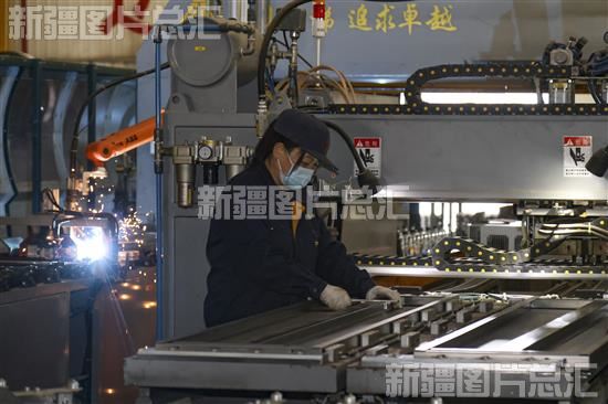 2023年3月9日,新疆天山电梯制造有限公司电梯门板流水线车间,工作人员在生产线上忙碌。