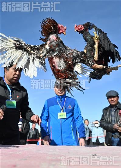 2023年3月21日,群众在新疆和硕县文体广场观看斗鸡比赛。