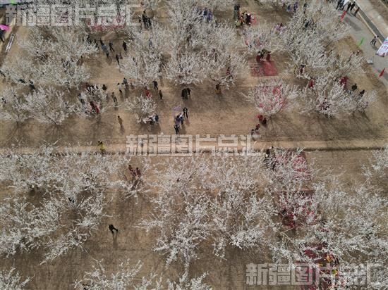 2023年3月25日、游客在杏园游玩(无人机拍摄)。