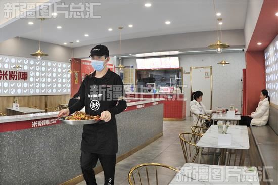 2023年3月6日,福海县“米粉阵餐馆”的工作人员在为顾客端上特色大盘鸡米粉。