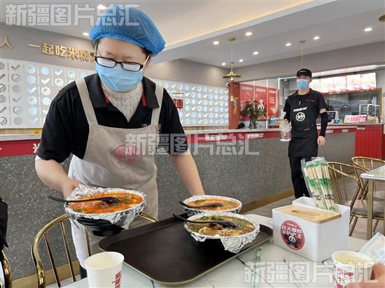 2023年3月6日,福海县“米粉阵餐馆”的工作人员在为顾客端上“温暖十里”特色米粉。